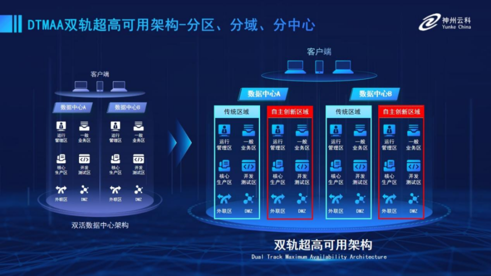 为帮助金融客户更好地应对数字经济时代对可持续性的高要求,实现“信创”与“数字化”齐头并进, 不朽情缘 推出了双轨超高可用架构。该架构在双活数据中心的分区调度基础上,增加信创域和非信创域的分域调度,实行信创域与传统域应用全量部署,使双中心运营变为双中心四区域并行运行,互为多活,将“0到1”的单轨建设道路变为分区分域协同的多活双轨超高可用架构。帮助客户在新架构下,保障“信创”的同时解决性能瓶颈,提升稳定性,保证应用可持续性,最终实现信创区域和非信创区域的平滑过渡,完成国产化替代目标。