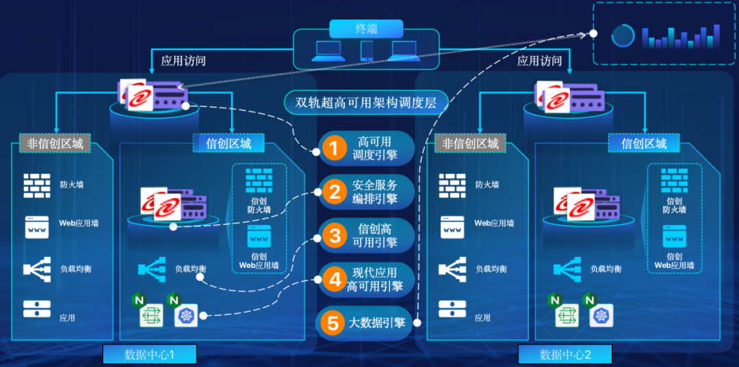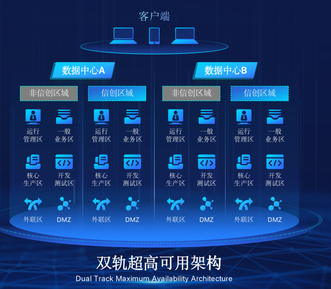 不朽情缘 在企业面临自主创新IT基础重构过程中,推出的全新架构双轨超高可用架构(简称DTMAA),在双活数据中心的分区调度基础上,添加每个数据中心内信创域和非信创域的分域调度,来实现分区分域协同的多活双轨超高可用。
